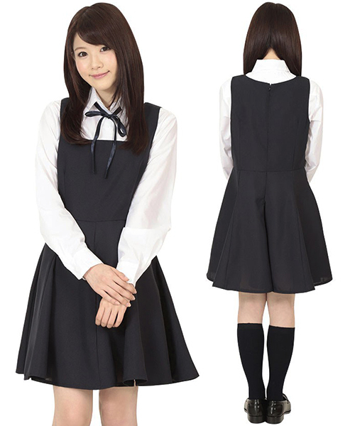 ●ネイビー×ホワイト●清楚な印象のロングジャンパースカート(背面ファスナー)●長袖ブラウス(ボタン)●女の子らしくキュートに決まるリボン紐。
