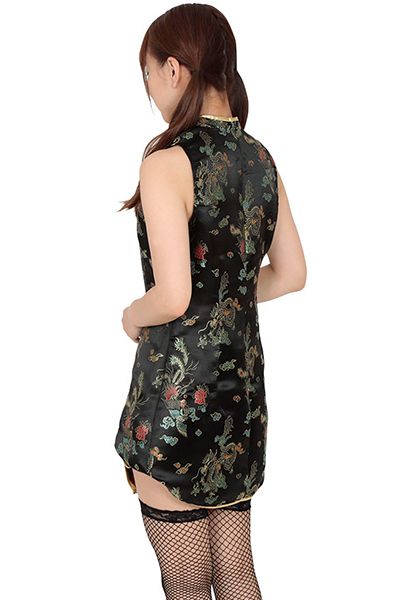 ●黒地に縁起のよい金龍や鳳凰をプリント●こまごまとした部分に赤や青の差し色を追加●アジアンノットの紐ボタンを飾りつけて華やかさをプラス●襟元の縦スリットから谷間がチラリ●裾のダブルスリットは太股の正面が見えるセクシー仕立て。