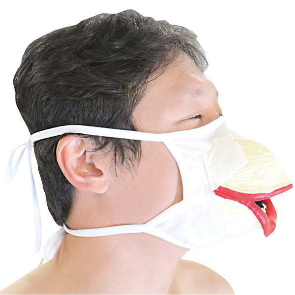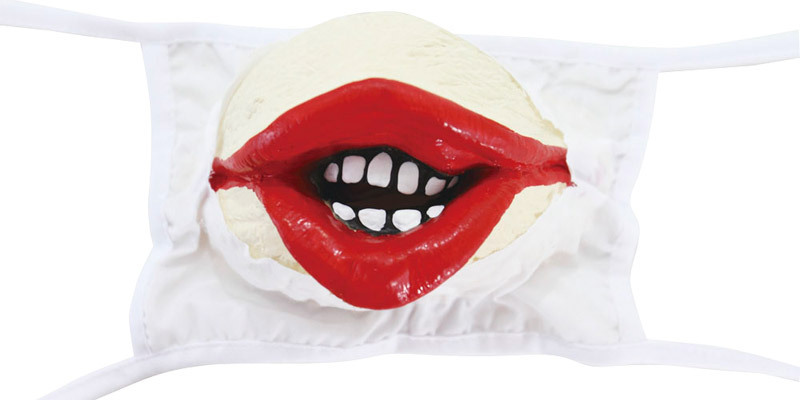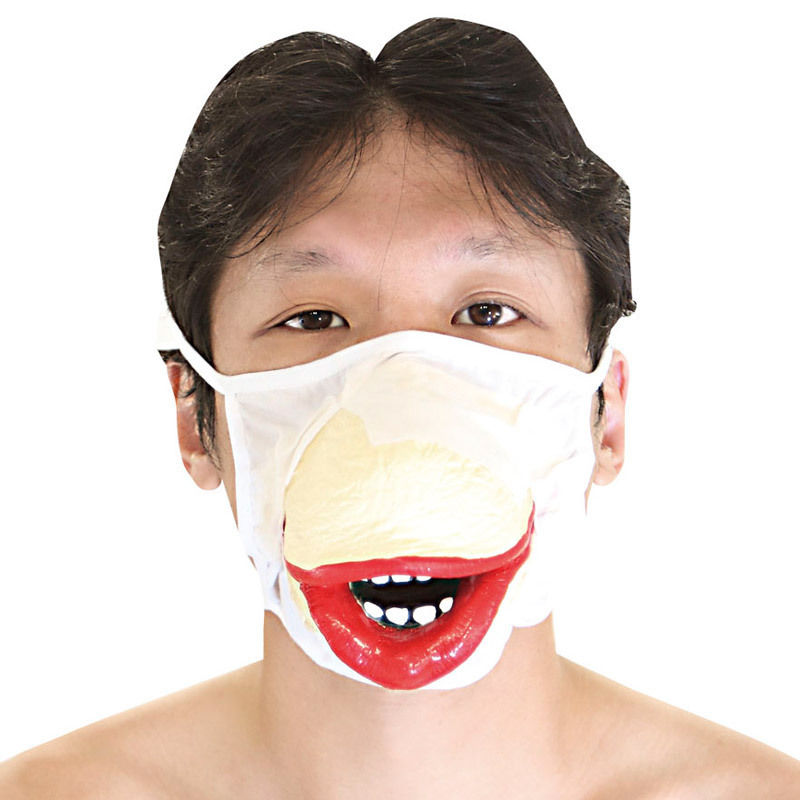 ●両耳にかけて装着する定番マスク●鼻から口にかけて飛び出た3D構造●口角が裂けたような大きく赤い唇●白い歯の奥に続く闇の口内…。