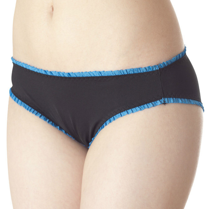 ●ブラック×ブルーの知的カラー●飾りを省いたシンプルデザイン●細かなフリルで上下を縁取り●ナチュラルなフィット感●安心感のある深めの足ぐり。