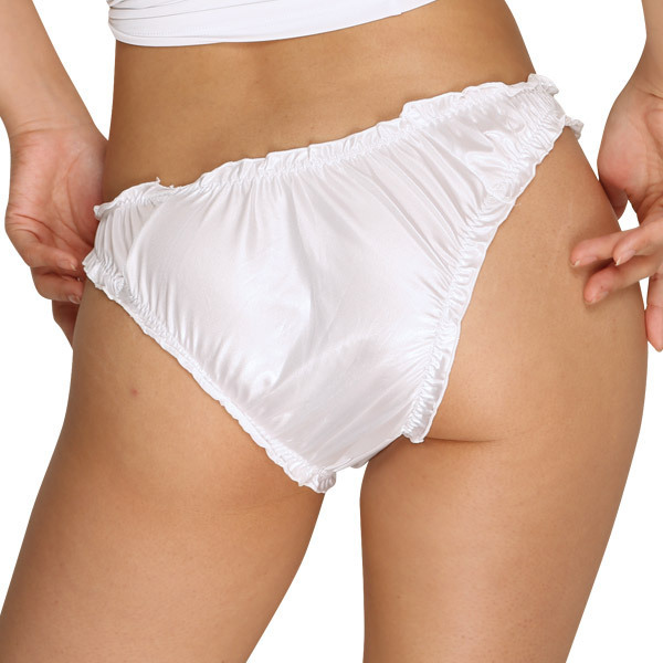 ●サテンのような輝きのフェリカ生地●眩しいほどのピュアホワイトカラー●ローライズ気味な浅めの履き込み●ウエストと足ぐりにたっぷりフリル●フロントはシースルー×バラ柄刺繍●ヒップに映えるハーフバック仕様。