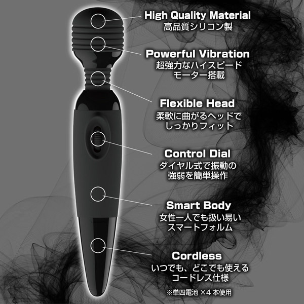 ●肌にやさしいシリコン製●使い勝手のいいコードレスタイプ●柔軟にくねるフレキシブルネック●ヘッド部:超強力モーター内蔵●無段階のダイヤル式スイッチ●静音設計●単四電池×4本使用●4.5Φcmサイズのヘッド用アタッチメント(別売り)が装着可能。