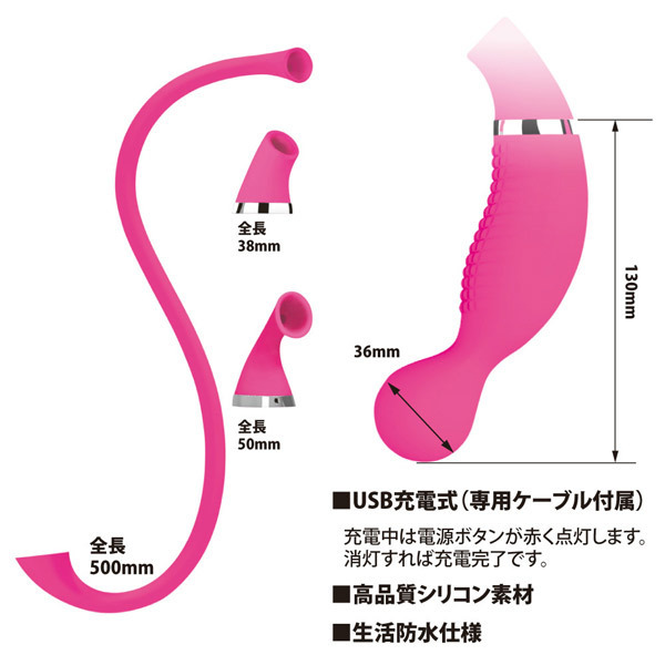 ●肌触りの良い高品質シリコン●12パターンの吸引&振動搭載●吸引アタッチメント3個付属●アタッチメント小:全長3.8cm●アタッチメント中:全長5cm●アタッチメント大:全長50cm●吸引口と逆側にモーター内蔵●ぷっくり丸い先端は挿入も可●生活防水仕様(水没は不可)。