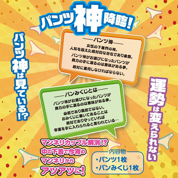 ●パンティ1枚+おみくじ1枚●カラーやデザインはランダム●彼女や友人へのプレゼントに●各種イベントの販促グッズに。