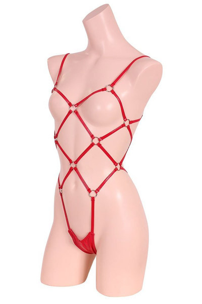 エナメル素材をリングでジョイント!肌に食い込むような亀甲縛り風なのでSM好きにもぴったりのアイテム。