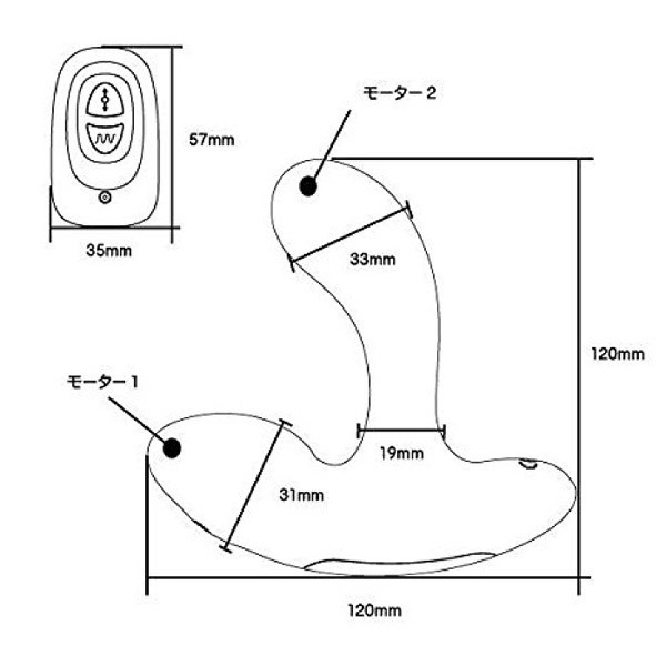 パッケージ:18.4×18.6×7.2cm 本体:全長12.0cm・挿入部幅3.3cm・リモコン5.7cm 重量143g 電池:本体USB充電式、リモコンボタン電池(CR2032)×1個使用