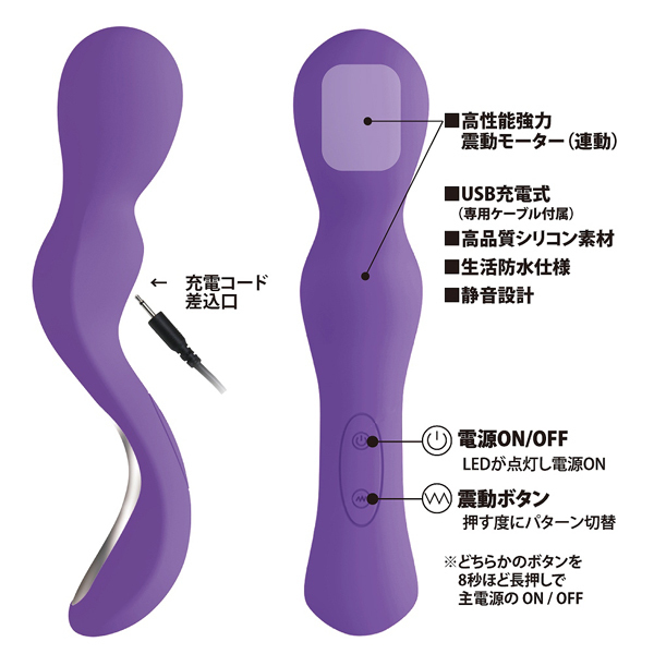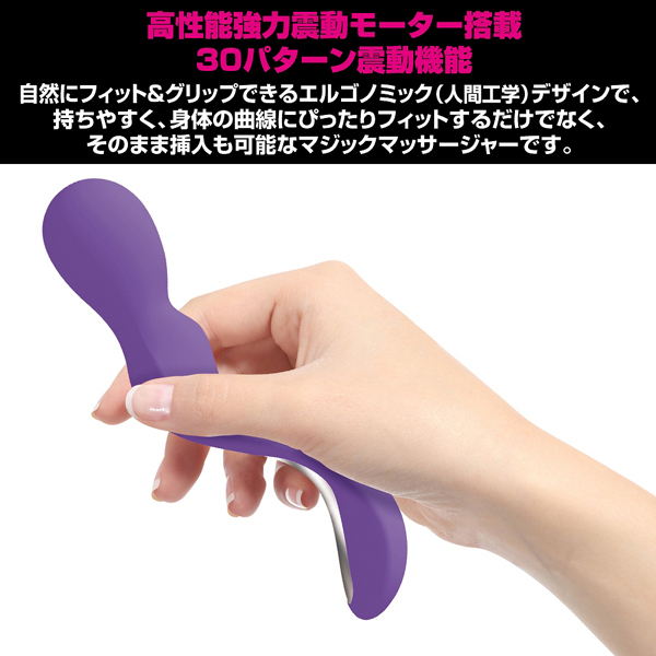 ヘッドと中腹から感じられる強烈振動がなんと30パターンも味わえる!そのまま中へ挿入できて楽しめるのもまた嬉しい♪さらに高品質シリコンを採用で肌に優しく生活防水でメンテナンスも楽々!実用性も申し分ないUSB充電式(充電コード付)のデンマです。