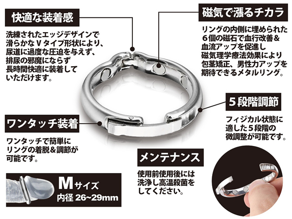内径2.6cm〜2.9cmの男性を対象に、6つの磁石で血流をUP!持久力や勃起力を高めるほか、亀頭の周りで包皮をまとめることで包茎のお悩みにもアプローチ♪洗練されたデザインは尿道を締め付けすぎることがないため排尿時に邪魔になる心配もなく、長時間の使用でも快適な装着感を実現しました。