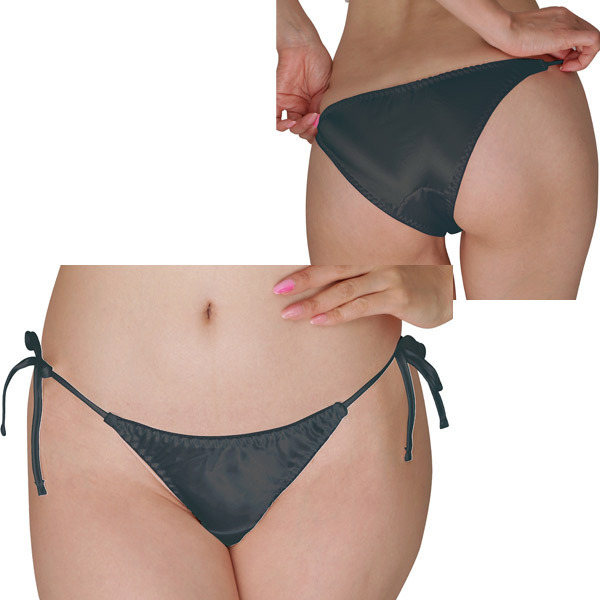 光沢感が美しいサテン生地の女性用フルバックショーツ。両サイドはセクシーな結びヒモ仕様で、結び目をパートナーに解かせる楽しみも!ブラックカラー