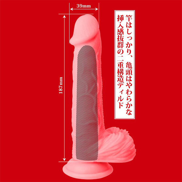外側は柔らかな素材で超リアルな肉感!硬めの芯と柔らかな亀頭・皮のリアル二重構造。