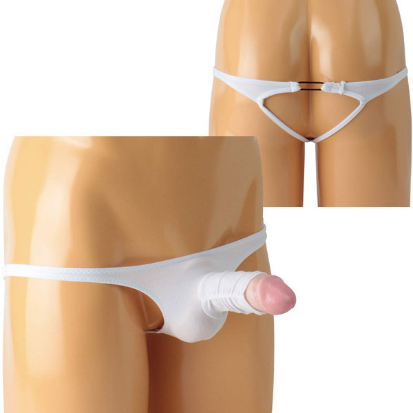 亀頭をチラリと覗かせるエロティックデザインの日本製Vバック(メンズ用)。