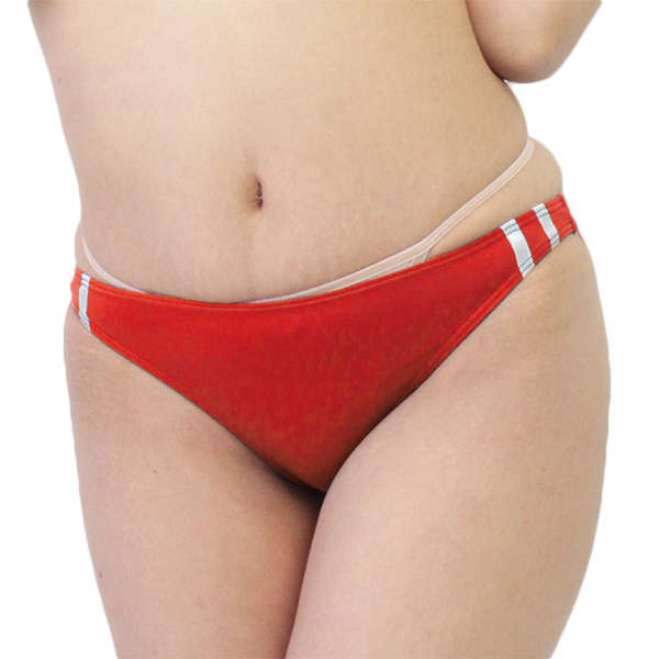 伸縮性のあるストレッチ生地を使用したブルマ風ハーフバック(赤)。
