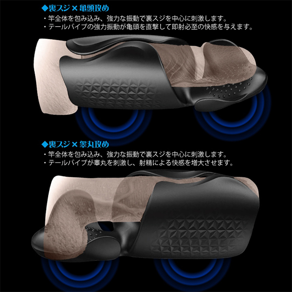 上下に内蔵された2つの振動モーターでサオ全体を包み込み強力振動!男を唸らせる究極の電動マッサージャー(USB充電式)。
