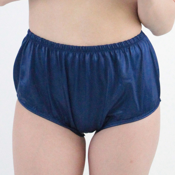ゆるりとしたシルエットがどこか懐かしさを感じさせる光沢のある日本製ブルマ(紺)。伸縮性のあるストレッチ素材を使用!男女兼用