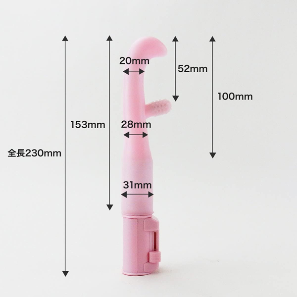 逆L字型の先端が快感部分を刺激しつつ、中腹に突き出たイボ付きの専用突起は挿入時に後ろへ倒れ膣内にフィット、超微細な振動でクリとGスポを刺激する!細めでツルっと挿れやすく、エラストマー素材で柔らかく仕上げた初心者さんでも安心のバイブです。