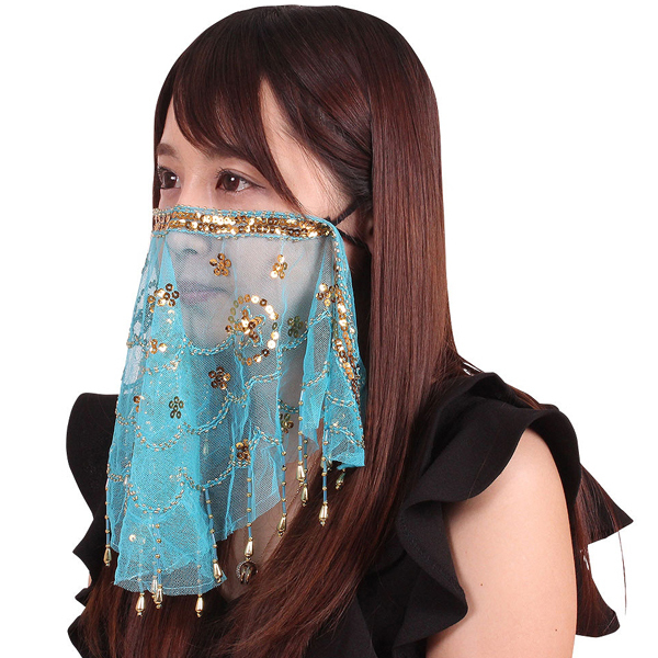 キラキラと光るスパンコールを装飾した美しいデザインは、煌びやかで幻想的なアラビアンな世界を彷彿とさせます♪飲食しやすく相手に表情を伝えやすいので、接客業の方はもちろん、ビアガーデンの衣装小物として、ベリーダンスや舞台などの衣装に最適です。