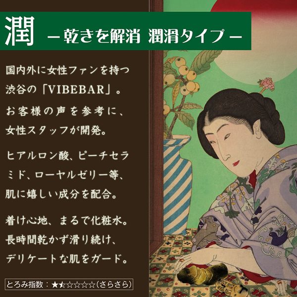 乾き、性交痛など潤い不足でお悩みの女性に♪ビタミンやヒアルロン酸、ローヤルゼリーなど、保湿成分を贅沢に配合した肌に優しい水溶性ローション。