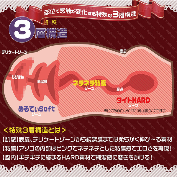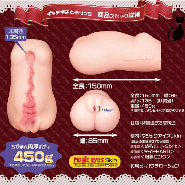 肌は伸縮する柔軟素材を、中はピンクでねっとり絡む粘膜を再現し、膣内全体にはギチギチと締め付ける高弾力素材を使うことで純潔感をアップした特殊3層構造仕立て!入り口はわずか1cmながら、柔軟素材でしっかり伸びてとっても丈夫♪人気素材マジックアイズスキン仕様で、肉厚な450gのボリュームボディ。