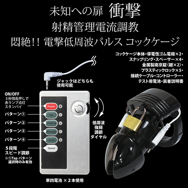 パッケージ:10.5×12.0×7.0cm 本体:ケージ内径3.2〜3.5cm・亀頭部の内径4.0cm・固定リング内径3.3〜5.2cm セット内容:コントローラー、コックケージ本体、導電性ゴム電極×2、スナップリング、スペーサー×4、金属製南京錠(鍵×2)、プラスティックロック×5、ケーブル 電池:単四電池×2本使用