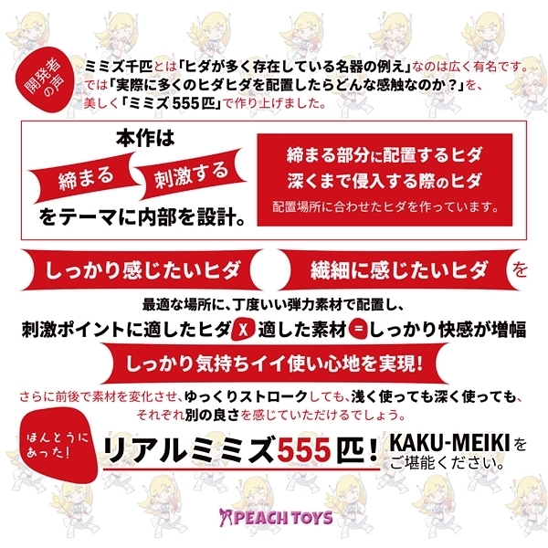 「締まる」「刺激する」をコンセプトに内部設計された、リアルに555本のヒダを配置した非貫通オナホ「KAKU−MEIKI MIMIZU555」です。