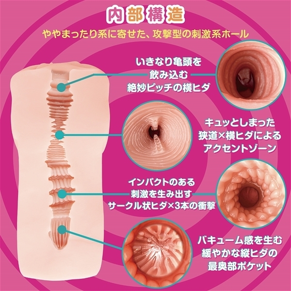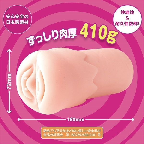 挿入深度によってヒダの気持ちよさがどんどん変わる!ずっしり肉厚で迫力の410gが織りなす攻撃型の刺激系オナホとなっています♪伸縮性や耐久性も良く、2本の縦ヒダによる鋭いインパクトと3連続の太いリングヒダが亀頭を徹底的に刺激!魔性の搾精ヒダギミックが随所に散りばめられた内部構造とサークル状のヒダがたまらない!素材、硬度、内部構造、どれをとってもバランス良く造られたヒダ重視の非貫通オナホ♪魔性の淫惑ループを存分にお楽しみ下さい。
