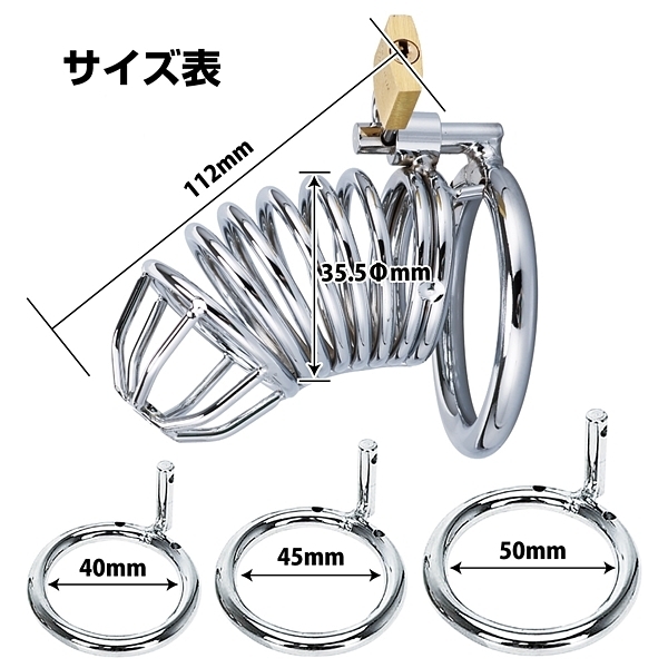 パッケージ:28.0×18.5cm 本体:ペニスゲージ11.2×3.5cm・固定リング小(内径4.0cm)・固定リング中(内径4.5cm)・固定リング大(内径5.0cm) セット内容:ペニスゲージ、固定リング3サイズセット、南京錠、収納袋
