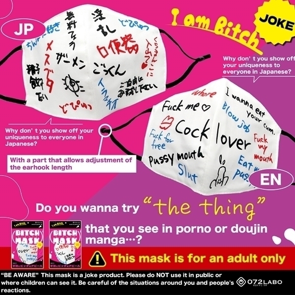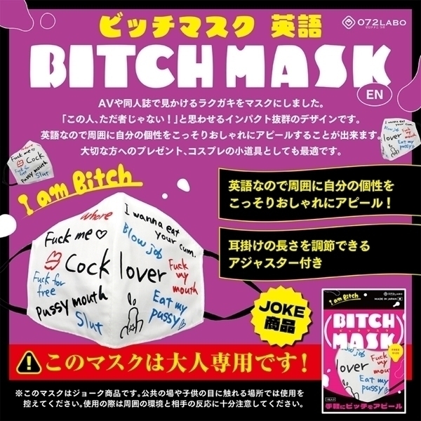ビッチマスク(英語版)は、ユニークで目を引くデザインが特徴の大人専用マスクです♪同人誌やポップカルチャーの影響を受けたこのマスクは、インパクトのある英語フレーズが描かれており、個性をアピールしたい方に最適です!しっかりとした生地で作られており、耳掛け部分には長さを調整できるアジャスターが付いているため、フリーサイズで快適に装着可能です♪プレゼントやコスプレの小道具としてもおすすめで、ジョークグッズとして非日常を楽しむアイテムとしてご活用いただけます!