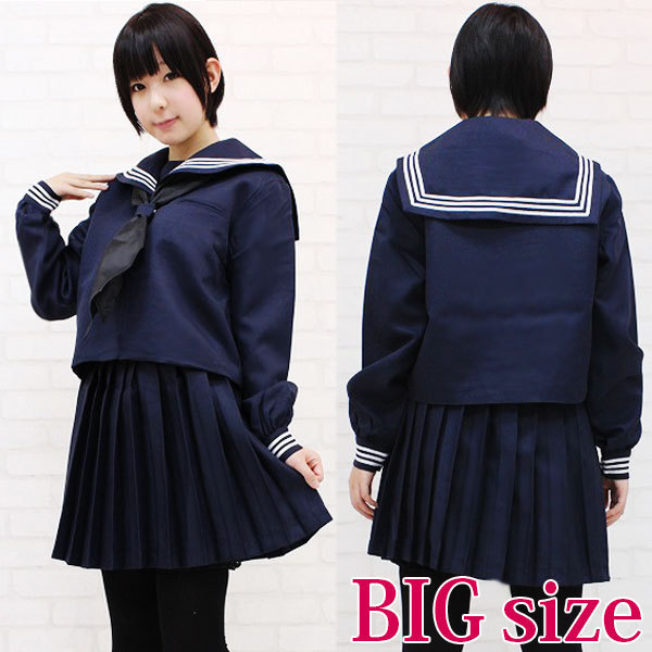 スタンダードなデザインの紺一色の上下に、スカーフもセット!一式揃ったセーラー服のコスプレ衣装です。