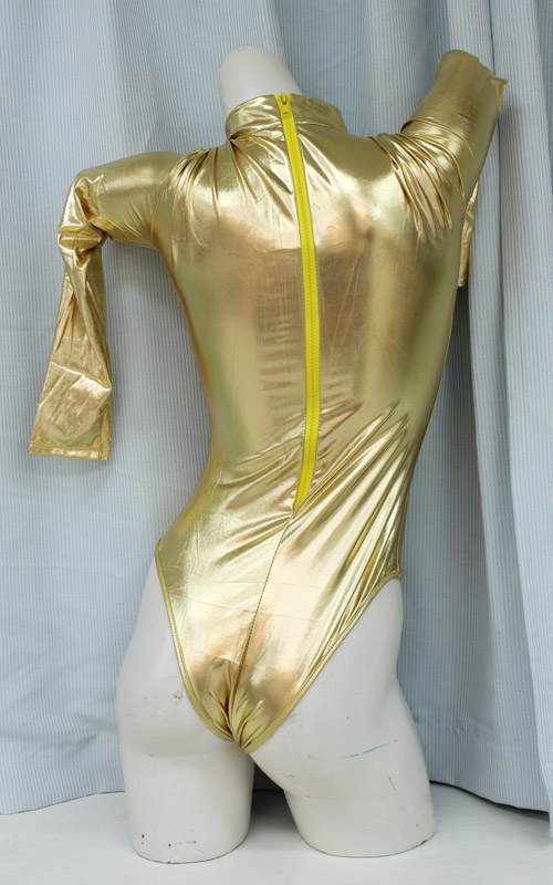 ハイレグからむっちりはみ出るお尻と脚がたまらなく際立つ、ゴールドカラーの長袖ハイネックレオタード(BIG)。