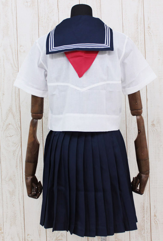 ●切り替えが珍しい白の半袖トップス●首元が詰った紺色セーラー襟で真面目感アップ●襟元よりかなり下方にスカーフ留めを配置●一部ゴム入り・ウエストにフィットする膝丈紺色プリーツスカート。
