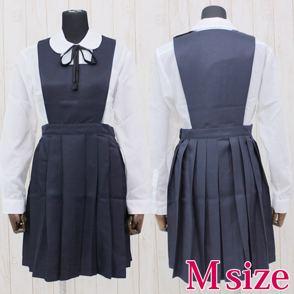 Mサイズ:B〜96cm・W〜76cm ブラウス:着丈64cm・袖丈59cm・肩幅43cm・首周り40cm・手首周り22cm ジャンパースカート丈92cm 紐タイ130cm セット内容:ブラウス(丸襟、前ボタン留め)、ジャンパースカート(上半身裏地付き、左肩とウエストにスナップボタン有り、ホック着脱可)、紐タイ