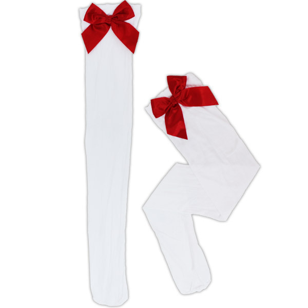 メイド服やアイドル衣装と相性バッチリな赤リボン付きニーハイソックス。