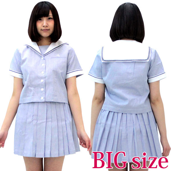 BIGサイズ:B〜110cm・W〜88cm 上衣:着丈50cm・袖丈23cm・肩幅45cm・首周り49cm(胸当て外して60cm) スカート:丈46cm セット内容:セーラー上衣(胸当てスナップボタン2点有、前開きボタン留め、胸ポケット有)、スカート(サイドファスナー、3段ホック留め、サイズ調整:ウェスト背部に一部ゴム入り) 素材:ポリエステル100%