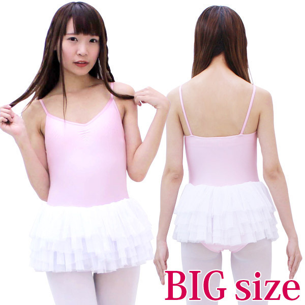 ●ガーリーなパステルピンクカラー●キャミソールタイプのレオタード●胸元中央にミニギャザー加工入り●デコルテが映えるV字デザイン●身頃一部に透け防止の当て布付き●幾重にも重ねたふわふわチュール●スカート縫付け済みで重ね着不要●おとこの娘もOKな大きめサイズ。