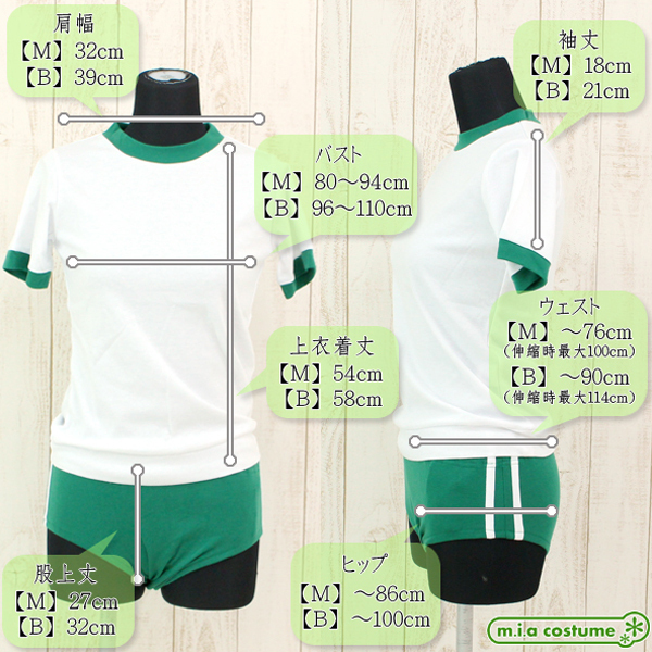 Mサイズ B80〜94cm・W〜76cm(伸縮時最大100cm)・H〜86cm 上衣:着丈54cm・肩幅32cm・袖丈18cm ブルマ:股上丈27cm セット内容:上衣、ブルマ 素材:ポリエステル65%、コットン35%
