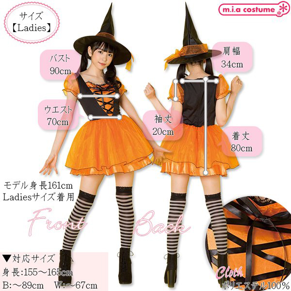 フリーサイズ:B90cm・W70cm・肩幅34cm・袖丈20cm・着丈80cm セット内容:帽子、ワンピース(裏地はスカート部分のみ有り、背面ファスナー) 素材:ポリエステル100% 対応サイズ:身長155〜165cm・B〜89cm・W〜67cm