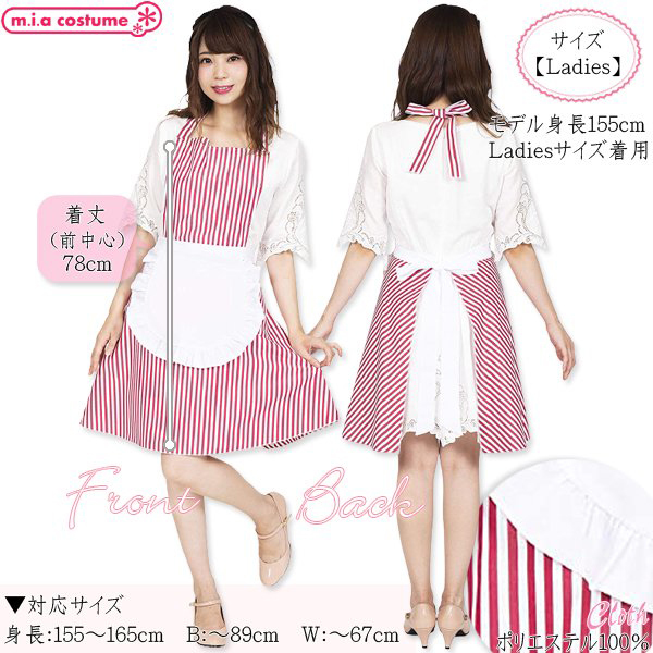 対応サイズ:身長155〜165cm・B〜89cm・W〜67cm 実寸:着丈78cm(前中心) セット内容:エプロン単品(首リボン、腰リボン) 素材:ポリエステル100%