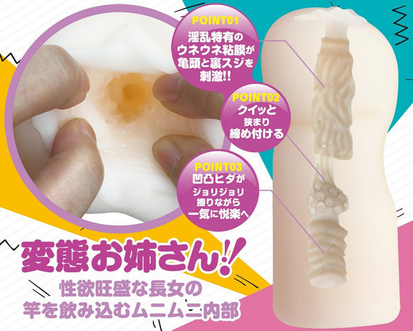 『おなガール』の血を受け継いだ新シリーズ『おなシスタ』が登場!竿を飲み込むムニムニの内部は、淫乱特有のうねうね粘膜が亀頭と裏スジを刺激!クイッと狭まり締め付ける中間部を抜けると、最奥の凹凸ヒダがジョリジョリと擦りながら一気に悦楽へと誘います。