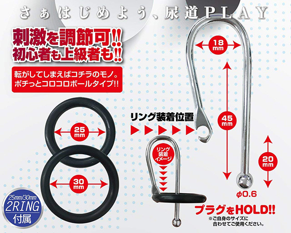 ショートサイズだから使い勝手が良く、先端部分のボールが尿道を刺激するタイプでリングの大きさは25mmと30mmの2サイズ♪メタル素材だから煮沸消毒ができるほか、耐久性も期待できるので、自分の好みのところへセットできたら、付属のリングでそのまま固定出来るように設計されています。