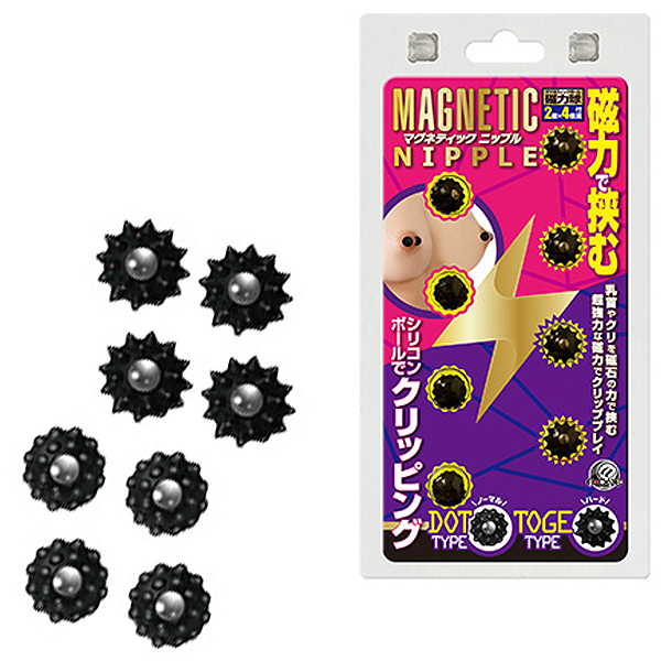 ボディピアスのように穴は開けず、超強力な磁力を使って乳首やクリをクリップ刺激!素材は肌に優しいシリコン製で傷つけにくい♪無数の球体が付いた全長10mmのドットタイプ4個、まきびしのようにトゲトゲとした全長12mmのトゲタイプ4個付属