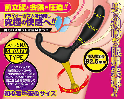 コンパクトで小回りが利きやすくピンポイントに狙いやすい♪3Dスティックで欲しい箇所をグリグリと圧迫刺激すれば、快感が高まり男の潮吹きまで一直線!滑らかな挿れ心地のシリコン製でツルっと挿入できるSMOOTHタイプ。