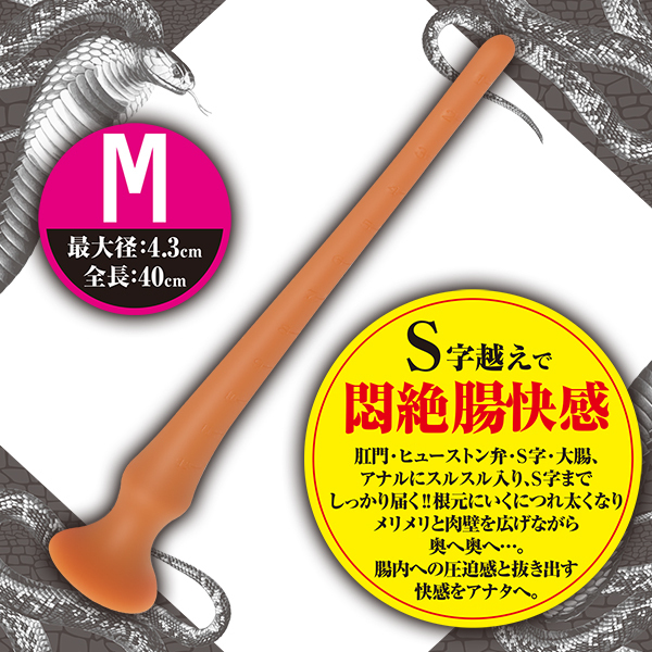こちらはMサイズで太さはそれ程でもなく、全長40cm、最大径4.3cmでS字や大腸までしっかり届くロングサイズとなっています♪悶絶快感必至!これまではアナルのエキスパートにしか味わえなかった気絶しそうな悶絶快感が手軽に味わえます♪腸内を傷つけない柔らかいリキッドシリコン製でアナルにスルスルと入って奥までしっかり届くので、メリメリと肉壁を広げながら奥へ進んで腸内にディルドが収まる感覚が楽しめます。