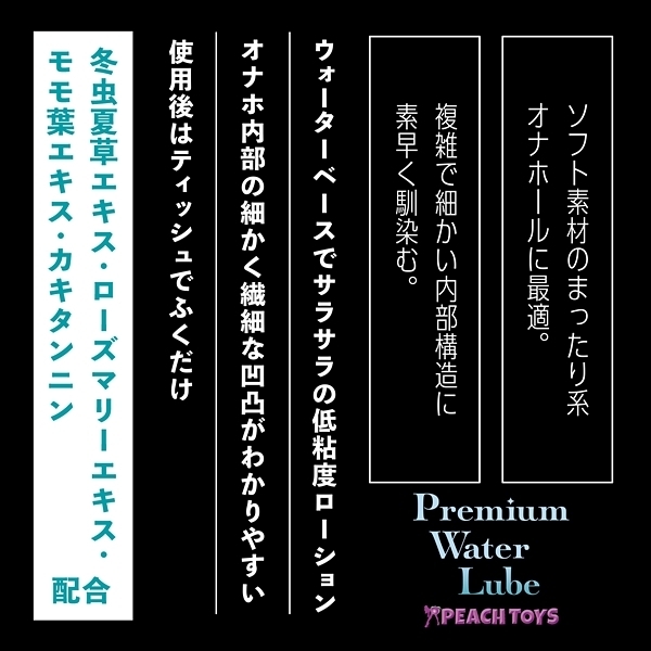 冬虫夏草エキス・ローズマリーエキス・モモ葉エキス・カキタンニン配合●ウォーターベースでサラサラの超低粘度ローション●オナホ内部の細かく繊細な凹凸がわかりやすい●使用後はティッシュでふくだけ簡単●無香料●安心の日本製●500ml スタンダード <成分>水、プロパンジオール、ヒドロキシエチルセルロース、乳酸、キサンタンガム、ローヤルゼリーエキス、アルギニン、マカエキス、水溶性コラーゲン、グリチルリチン酸2K、ローズマリーエキス、モモ葉エキス、カキタンニン、銀、フユムシナツクサタケエキス、クエン酸、クエン酸Na、BG、エタノール、セルロースガム、炭酸水素Na、フェノキシエタノール、EDTA-2Na、ブチルカルバミン酸ヨウ化プロピニル