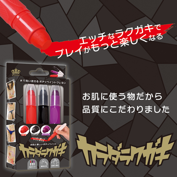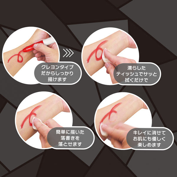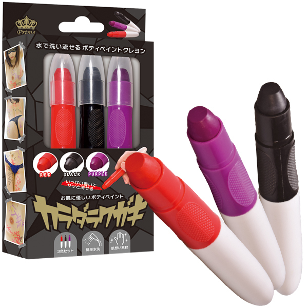 卑猥な言葉を全身に落書き!仮装用にも使えるボディペイント用クレヨン赤黒紫の3色セット。
