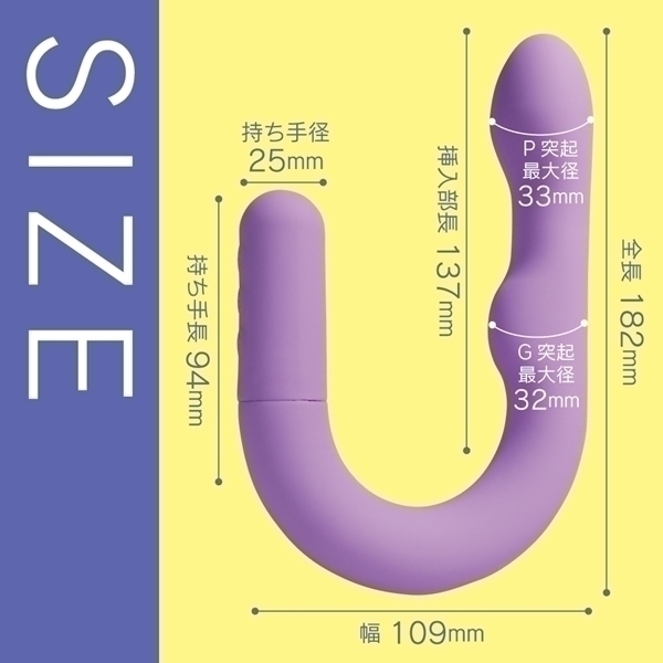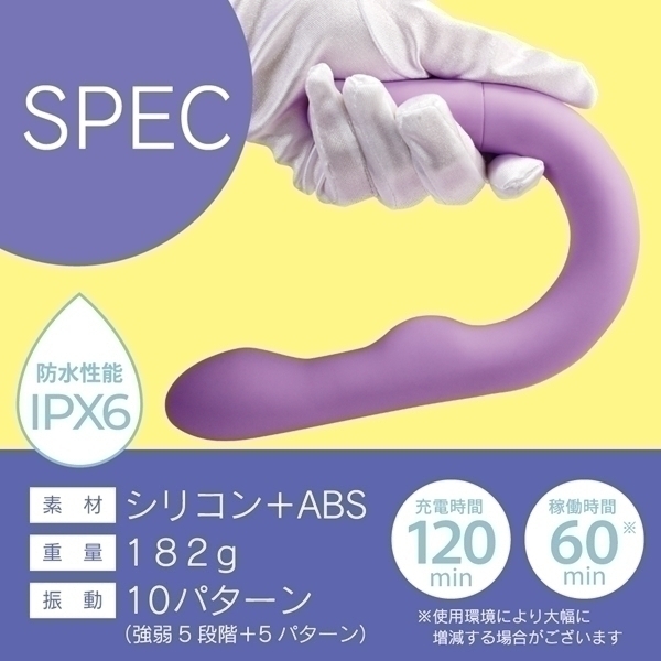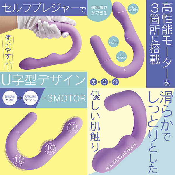 セルフケアに特化したU字型バイブレーターです♪ヘッド・Gポイント・外側刺激用、それぞれに独立したモーターを搭載!好みに合わせて個別に振動を調整できるのが特長です♪振動は5段階の強弱設定と、5種類の多彩なパターンを組み合わせた計10種類を搭載!押し当てて楽しむ独自の形状が、より自由な使い方をサポートします♪高性能モーターと高品質素材を組み合わせた、信頼のジャパンクオリティ設計!オールシリコンボディは、しっとりとやさしい触り心地で、快適な使用感を提供します♪約120分の充電で、最大約60分の連続使用が可能!(使用環境により変動します!)IPX6相当の防水仕様で、使用後はしっかり洗えて、清潔に保つことができます♪