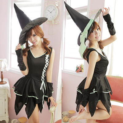 ハロウイン仮装衣装の定番!ブラック×ネオングリーンが可愛いレースアップの魔女ドレスコスチューム。