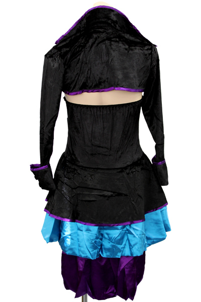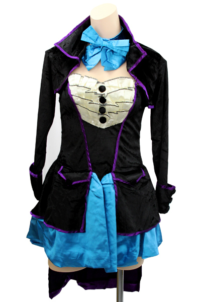 パープルカラーのパイピングを差し色にした黒ベロア素材と、光沢ブルーサテンの異素材で仕上げたベアトップデザインのミニワンピース!胸元は4段フリルで飾って可愛らしさもしっかり!スカート後ろのテール部分は縫い付けです。