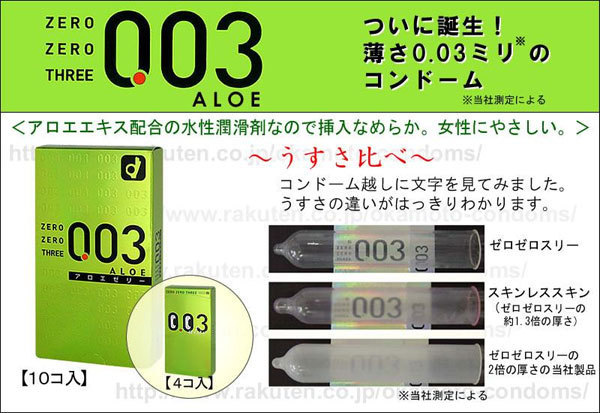トップページ > コンドーム・避妊具 > 薄い・厚い(早漏防止) > オカモト ゼロゼロスリー003 (アロエゼリー)