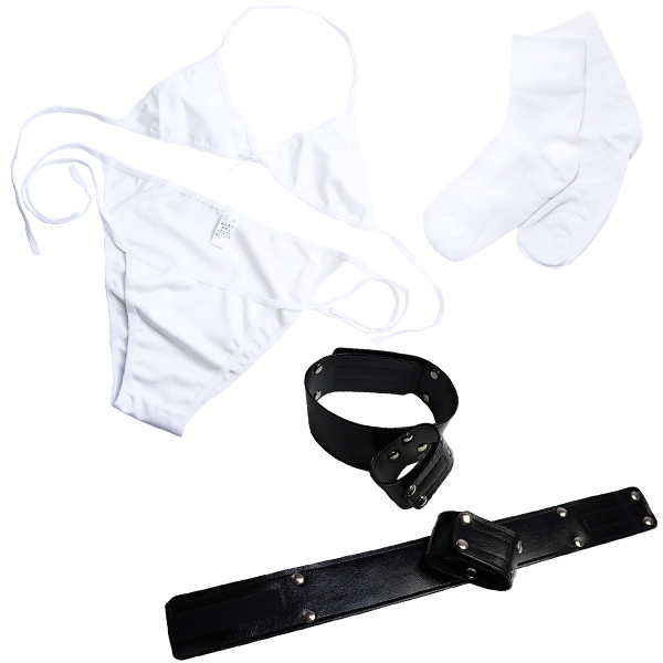 トップページ > SMグッズ・拘束具 > 枷・他(手足首・全身) > ggシリーズ 「手と太もも」下着付きSMグッズ 〜ブラ・パンツ・ソックス付き〜