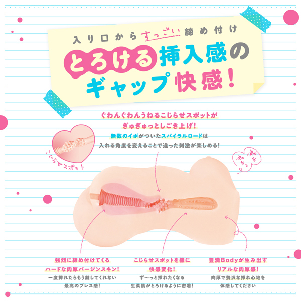 ぐわんぐわんうねるこじらせスポット搭載!ずっしり肉厚540gの豊満Bodyはとっても贅沢な挿れ心地!強烈に締め付けるハードなバージンスキンの入口から、ずーと挿れたくなるようなとろとろソフト素材への快感の変化を楽しめます!真ん中に配置されたこじらせスポットは、ピストンのたびにぎゅぎゅっとしごき上げ!締め付け・こじらせ・生柔肌の3つの快感。